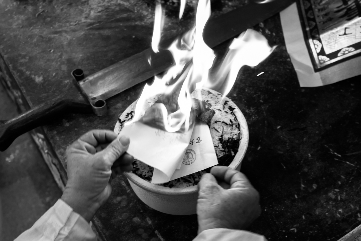 Upon arriving at about 10am, I joined the procession of devotees to cross the bridge. I know it looks like an all men activity from this photo but everyone was invited to cross the water and be cleansed. Each person crossing is waved at 7 times with joss paper. Here is my view as I was crossing with the temple member waving at me and the photographers documenting the moment. The tall foreign lady was a novelty at first, but it didn’t take long until the photographers were more concerned with keeping me out of their photos!